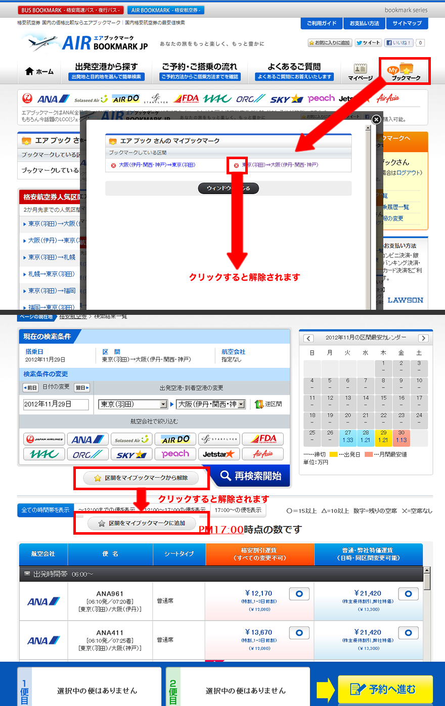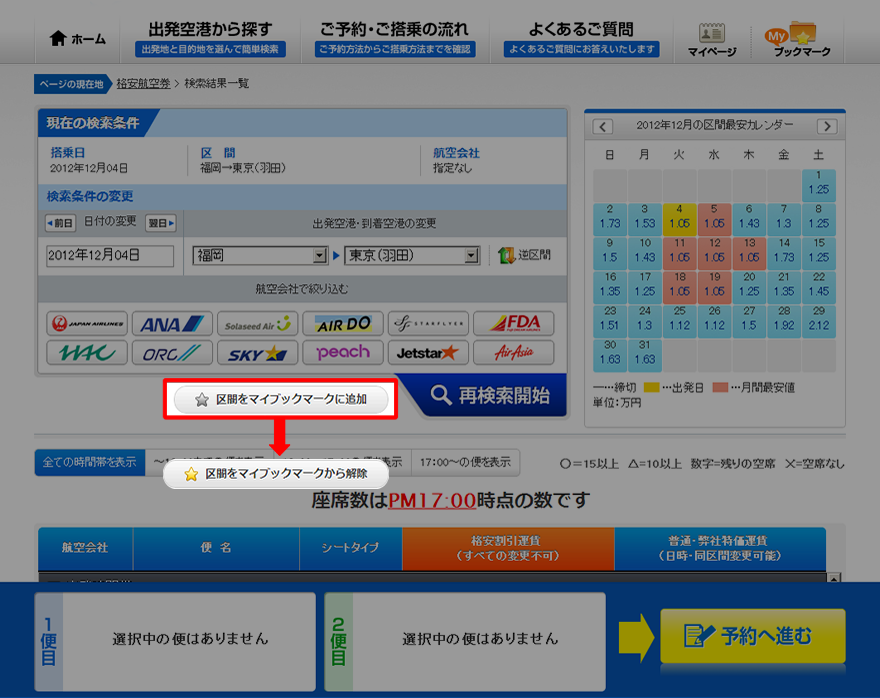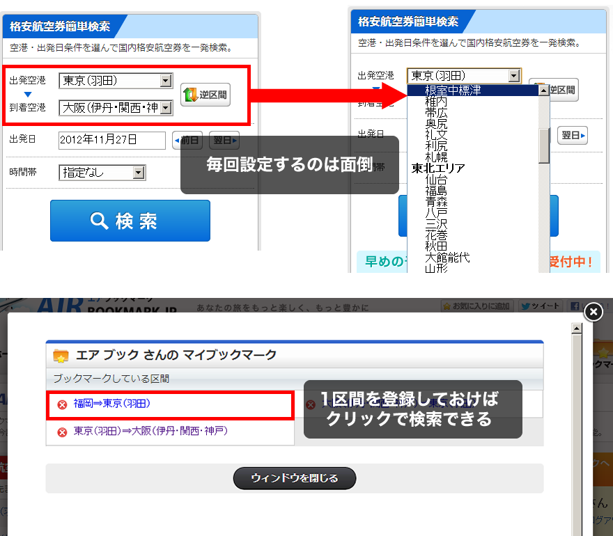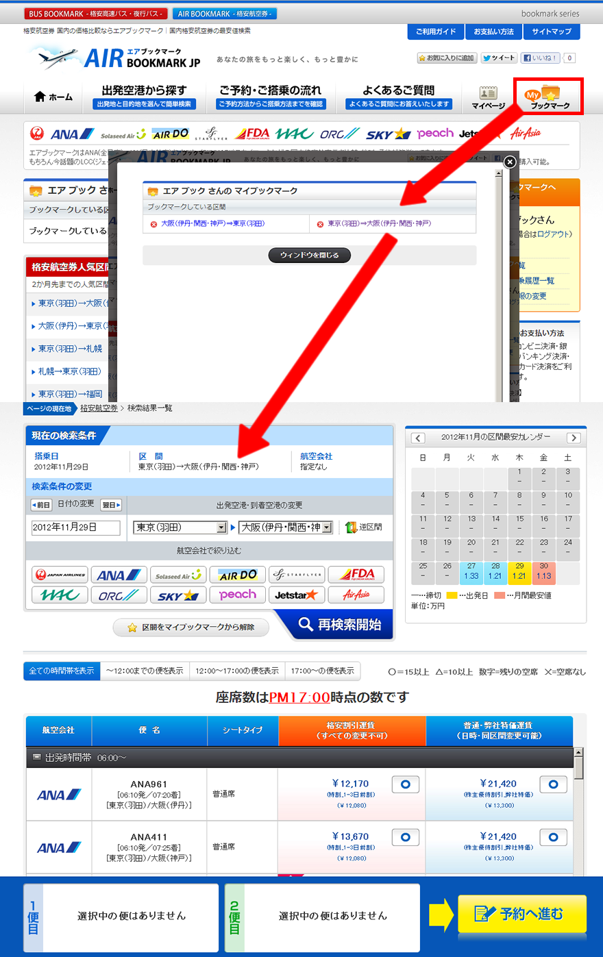 マイブックマーク機能とは、いつも利用している空港間をブックマークしておけば、すぐにご希望の航空券を探すことが可能です。